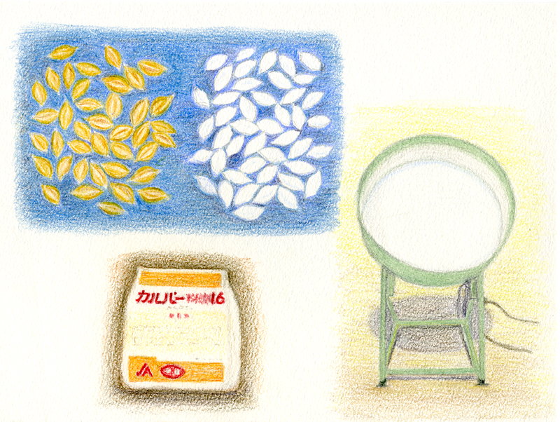 催芽種籾の発芽を損なわずに、過酸化石灰を籾に固着させるのはむずかしい。ゼラチン、アラビアゴムなどと、さまざまな材料を試したが、いずれも失敗、最後にたどり着いたのがこの焼石こうだった。