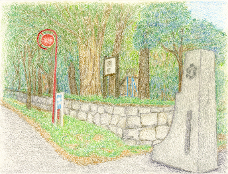 七重小学校前の国道5号に今も残る赤松並木は明治9年(1878)の天皇行幸を記念して、湯地らが植えたものという。この松並木と小学校前の石垣がわずかに昔の面影を留めていた。