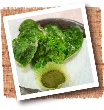 ○すいおう生葉/数枚 ○薄力粉/10g ○卵/10g(1/5個) ○水/10ml ○サラダ油/適量 ○すいおう粉末/少々 ○塩/少々
