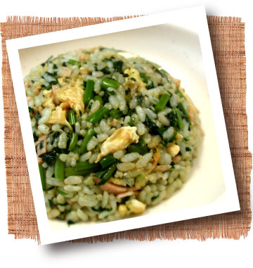 ○すいおう生葉/160g ○白米飯/400g ○ハム/80g ○卵/2個 ○ねぎ/4cm ○しょうが/少々 ○こしょう/少々 ○しょうゆ/8g ○サラダ油/30ml ○塩/少々