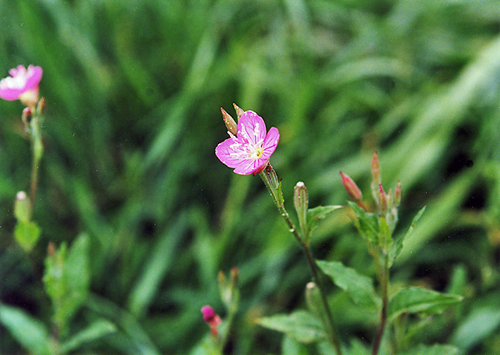 (アカバナ科)| 坂川の土手を散歩していて、スイバやハルジオンばかりの川岸にふと赤い花を見た。一茎持ち帰って図鑑を調べて名前を知った。 ユウゲショウとは優雅な名前である。アメリカ原産で、明治時代に栽培されていたものが野生化したという。コマツヨイグサに近いと図鑑を開いたので、 あまり苦労しないで見つかった。数日後再び土手を歩いたら、辺り一帯草むらが既に刈り取られ、跡形もなかった。 |