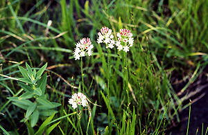| 地蔵山と熊野岳の間のコルを下っていろは沼に着くとそこは華やかな花の競演であった。池塘にはイワショウブとキンコウカが競いあって、 ところどころにオオバノギボウシの薄紫が色を添える。イワショウブの花は白とつぼみのピンクがバランスよく可憐で楽しい雰囲気である。 |