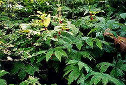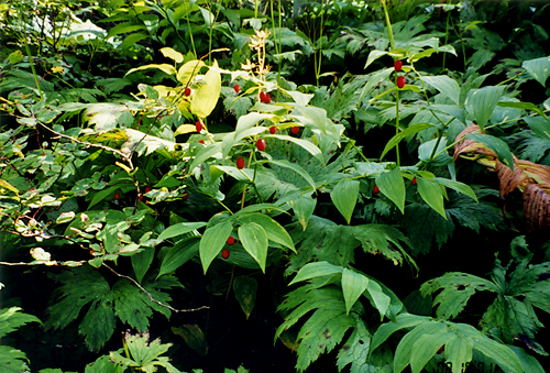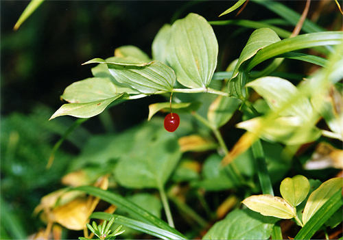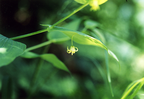 | ユキザサのようだが少し違うと茎を摘んでみたら、裏に可憐な花がさがっていた。花の黄がなんとも言えず良い。姿は小さいがおもしろく一目惚れである。 こんな出会いがあるからやめられない。しばらく有頂天で出会うたびに葉の裏を覗いてみた。 |
