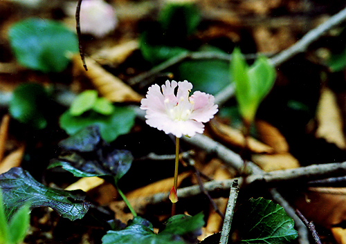 東北向きの斜面に点々と白い花が咲いていた。径3cmほどもあろうか、薄い花びらの周りが切れ込んで間違いなく初対面である。枯れ葉の積もった斜面にふっと浮かんだ姿が夢のようで、 しばらく見とれていた。帰宅後イワカガミに近いだろうと図鑑をめくり、簡単に見つかった。 |