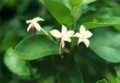 駐車場からプールに下る坂道に咲いていたが、スーッと延びた赤い雄しべと白い花びらのコントラストが妙にバランスがとれて南国の夕日の中で美しかった。 (別名:ガジャンギ) |