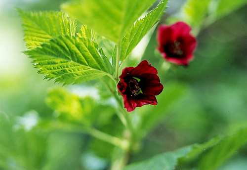タカミネザクラの写真を撮っていたら、横から家内がこれを写せと小さな赤い花のついた枝をつまんでいる。 写真は構図もまあまあで、鮮やかな赤が緑に浮き、この日一番好きな写真になった。