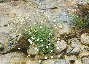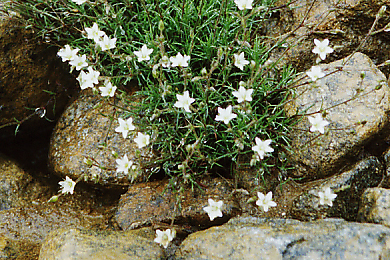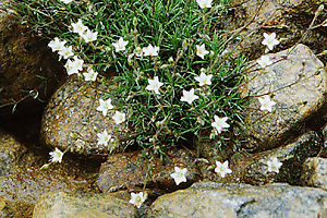 | 宝剣小屋から中岳への道で、岩の根元に夜空に撒いた星のような白い花が咲いていた。 そのときは接写し過ぎて花のもつ夢のような繊細さを写し得なかった。 早池峰で再びこの花に巡り合ったときは身内にあったように嬉しかった。大好きな花である。 |