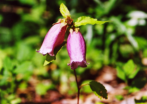 (キキョウ科)| このコースでは数が少なかったが、終点近く道端に1株咲いていた。寝ころんでカメラを据え、これはいただきとシャッターを切った。 まだ花に興味を持っていなかったころこの花に出会って強く惹かれて以来、今まで何回も出会って気に入った写真が撮れなかったが、 ようやく満足できるものを写すことができた。 |