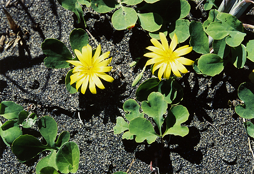 羽幌のホテルを発って日本海沿いに少し南に下ったところの海岸で孫たちを遊ばせて、さあ朱鞠内湖に出発しようという砂地の道に点々と咲いていた。 照りつける陽射しの下で鮮やかな黄色の花と変わった形の葉が目を惹いた。地面を這うような地低な姿ゆえ風にも揺れず、ピントもあわせ易い。