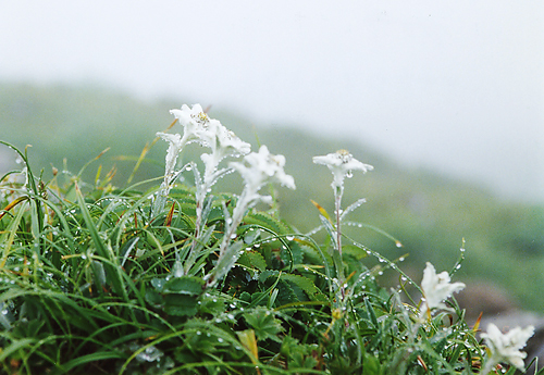 (キク科)| 花を楽しみながらようやく頂上に登り、下りはひどい雨になった。道は沢に変わって靴の中までビチャビチャ音がする。 ねらいのウスユキソウも雨の中でうなだれていた。8合目位まで下ったところで、道に沿って一段高く、雨を含んだウスユキソウが暗い空に浮いて見えた。 |