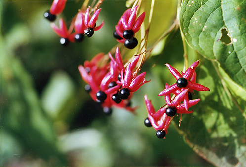 (クマツヅラ科)| しゃれたデザインと思い切った色の組合せにびっくり、座り込んでしばらく見とれた。実の煮汁は布をアサギ色に染めるとか、 根は薬だとか、葉や枝はひどく臭いとか、話題に事欠かないが、散歩していた日曜日の朝、真っ赤なガクの上で陽に輝く黒い実はとにかく美しかった。 |
