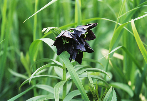(ユリ科)| ゆっくり時間をかけて木道を歩く。青い空の下、見渡す限り人の姿もない。揺れる草面のうえ、雲がながれ、シマアオジの求愛のさえずりが聞こえる。 これ以上求めるものもない。原野の駐車場に戻ってクロユリに出会えるなんて夢にも思わなかった。猿仏で、乗鞍ですれ違い、見ることのできなかった花である。 草の間に隠れている花の前に座り込んでしばらく見とれていた。 |