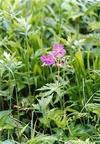 (フウロソウ科)| フウロソウはそれほど珍しいものではないが、華やかで優しい風情でいつも目を惹く。しかし種類の区別にはいつも苦労する。 櫛形山の頂上近くのアヤメ平から少し下った草原に咲いていた。この辺りフウロは散見する程度であったが、それでも目を惹いた。 |