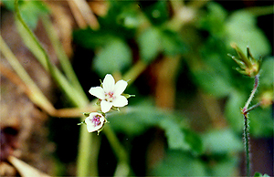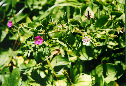 宿の庭に咲いていた。一見してゲンノショウコと判った。それにしても赤も白もつつましく可愛い花で、出会うたびに懐かしく見とれてしまう。 数年前赤花を見て以来だったので何かのセットが揃ったようで大変嬉しかった。