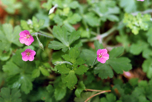 (フウロソウ科)| 調査に入った放牧草地で、かわいい小さな花を見つけて座り込んでいた。小野さんがこともなげにゲンノショウコと教えてくれた。 何気なく草陰に咲いているが、捨てがたい魅力的な小花である。薬草としてあまりにも有名であるが、その効果が”現の証拠”だという。 なんだか落し話のようでおかしい。 |
