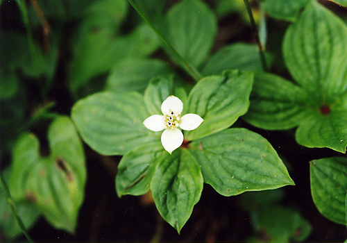 (ミズキ科)| お庭と呼ばれるように、岩岩が美しく配置されている平場にたどり着いて昼食と風景を楽しみ、再び登りにかかったところで岩の間にりんとしたこの花が咲いていた。 輪状に広がる光沢のある葉のまん中に咲く白い花は言われぬ気品がある。踏まないようにと足元に注意したら、一面この花が広がっていた。 |