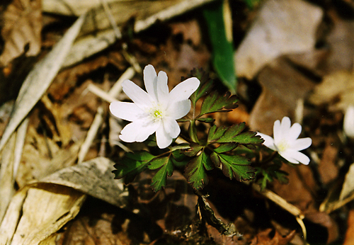 (キンポウゲ科)| 訪れた奥塩原の大沼はまだ早春の趣であった。ひんやりと風の吹く沼の畔で弁当を食べて歩き始めた岸辺に点々と咲いていた。切れ込みの深い葉が印象的であった。 柔らかな陽射しの中に、群生しないで一輪ずつ、ちょっと寂しげにすっと立ち上がっている。静かな早春の雰囲気ととけあって気高い。淡紫色、時に白色というが、 ここの花はすべて白であった。沼を離れて杉林に入ると、もう姿を見られなかった。 |