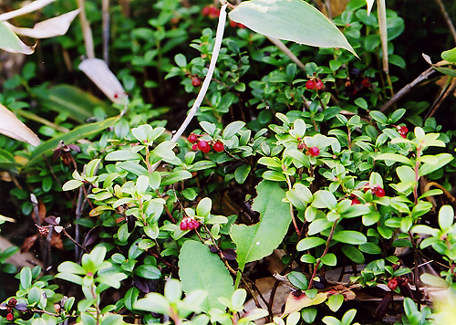 ワサ小屋を過ぎて、笹が覆う草原の小道をブラブラと歩いて道ばたで見つけた。栂池で見たものは納得がいかなかったが、これはコケモモと直感した。 陽に輝く小さなピンクの実が可愛い。クロマメノキやシラタマノキなど見分け方をはっきり教わりたいと思う。