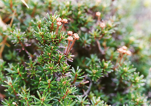 三方が峯を廻って旅館に戻り、ガンコウランが咲いていたと話したら、若主人が形を聞いてそれは雄花だと教えてくれた。 後日雌花も見て納得。 雄花は長い花柄が花を高くかかげているので、雌花より見栄えがする。