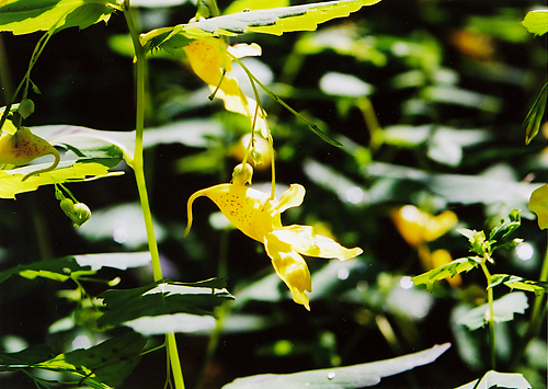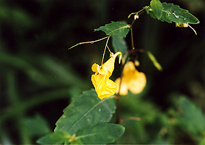 河童橋から明神池に向かって歩き出してすぐ、この花に会えた。細々とした糸で釣り下がり、風に揺らぐ鮮やかな黄色が楽しくて見とれていた。 |