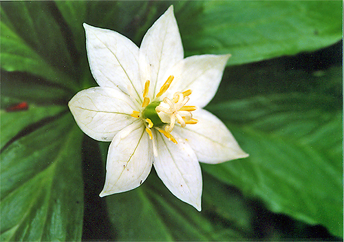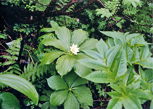 道端に大きな群落があって、さすがに人だかりになっていた。カメラの放列の中、スタ−なみである。 車のように整った葉のまん中にスッキリと気品に満ちた白い花はまさにスタ−である。ストロボを使ったら赤味を帯びた。