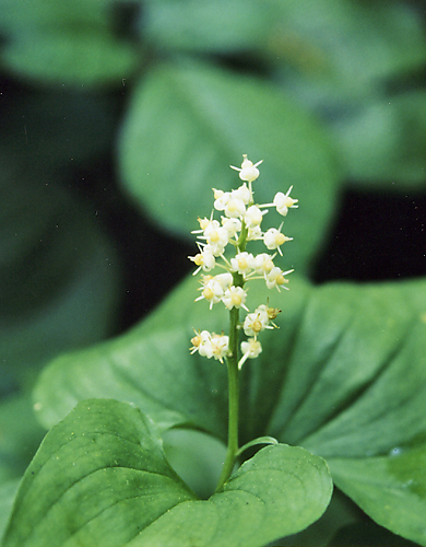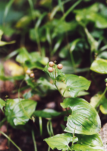 | 櫛形の頂上付近の平坦な道は、この花を踏まないで歩くのが困難である。光沢のある葉が一面に広がっているのはあちこちの山でみられ、 あまり沢山あるのでかえって見落してしまうが、花をみることは意外に少ない。それにしても懸命に咲くこの白い小さな花はいとおしい。 |
