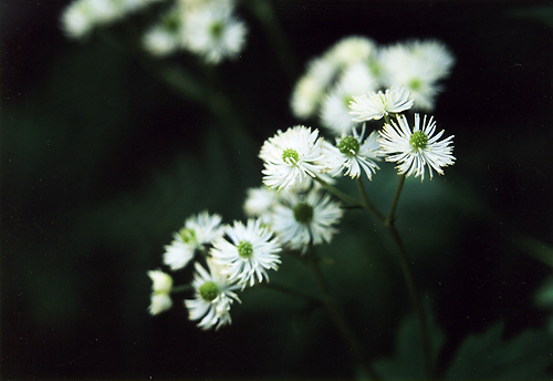 | カラマツソウは好きで、出会うたびに足を止める。よく似ているが葉の形がまるで違うと思うし、緑色の管状花もカラマツソウでは目立たない。 モミジカラマツという名札を見てこれがと驚いたが、日本に同属が20もあると知って妙に納得した。ここでは両方が全く隣り合わせに繁っていた。 |
