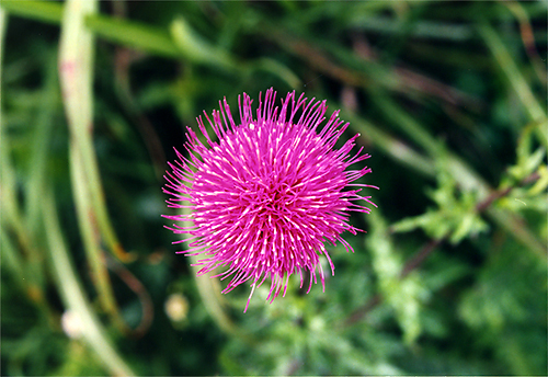 この濃いピンクがキスゲの黄色と競うように緑に浮いていた。見過ごすにはあまりに華やかでカメラを向けた。アザミは刺がきついが、 この繊細な花のつくりは見事としか言い様がない。