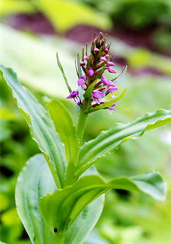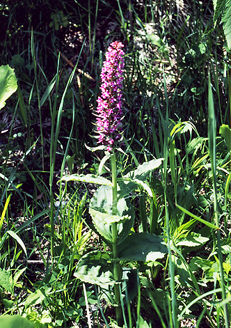 | 花序がハクサンチドリより密で、花の間に葉であろうか萼であろうか顔を出している。葉の周辺が妙に波打っている。ハクサンチドリとは違うなと直感した。 羽幌から朱鞠内へ、すれ違う車もなく、ただただ緑の中の山の間の長い道を走って少し疲れて降り立った道ばたはこのラン科の花ばかり盛りであった。 |