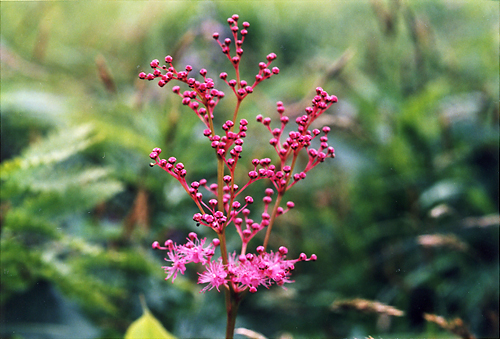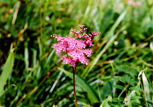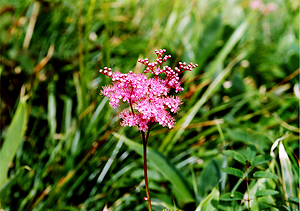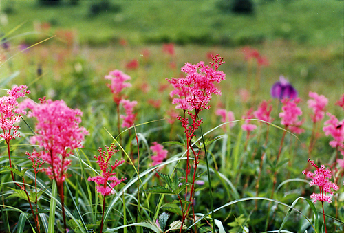 | 八方は爽やかな風の中、青空に白い雲が流れてご機嫌だった。斜面を点々と彩るこの花に再会して、思わず嘆声を上げる。 緑一面をバックに夢の中のようにかすむピンクの開いた花、きりっと輝くつぼみ、深呼吸をしながらただただ見とれるばかりである。 |