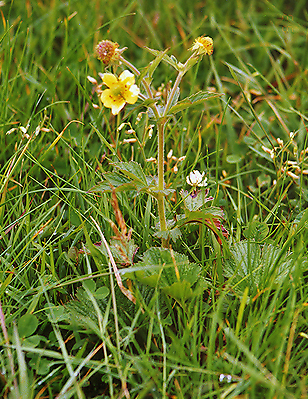 尻屋崎で思いもかけず花々の歓迎を受けて有頂天であった。広い草原と海と空の間で、スカシユリやアサツキの派手さに比べて、これはまた地味な花である。 バラ科というのに名前も気の毒であるが、そう考える方がおかしいのかもしれない。