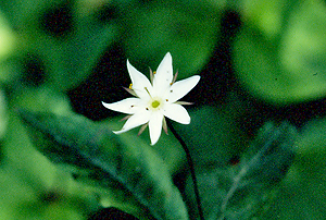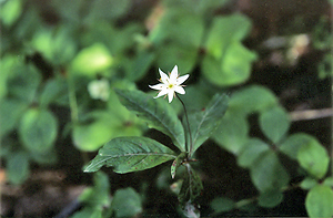 | 深い林の中で、凛として花びらを張る。胸を張って美しく生きている思いがする。栂池では密かにこの花に会えることを期待する。 そして今年も出会うとほっとする。花が赤く縁どりがあるのが名前の由来と書いた図鑑があるが、まだ縁どられた花を見たことがない。 |