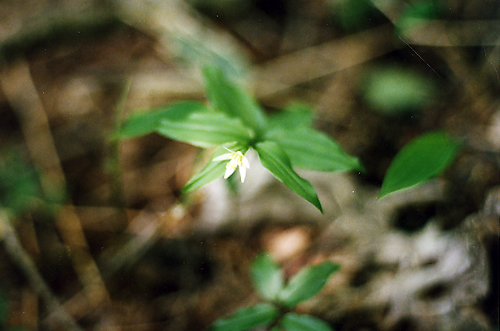 ユリ科というのになんと弱々しく淋しい。いつも林の下草の間に隠れている。たった一輪の花が申し訳なさそうにうつむいている。 この写真を撮ったのも甲子温泉近くの湿っぽい林の中であった。