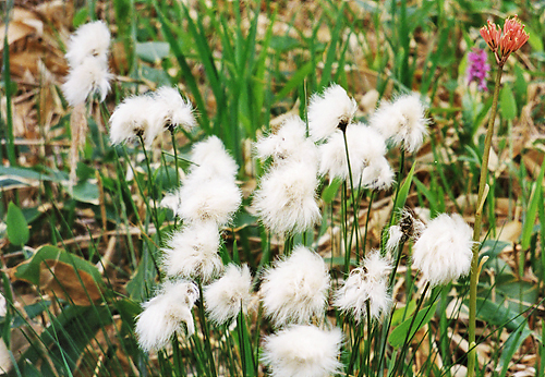 (カヤツリグサ科)| テレビで湿原を紹介すると必ずと言っていいほど映し出されるが、個人的には条件に恵まれた対面はそれほどない。 今回も明け方の雨に濡れて果実の哀れな毛が風にそよいでいた。パンケで見事な一群を見つけた。はじめてワタスゲを見たと言うほどの楽しさで、 しばらく風と戯れる穂を見ていた。この写真は家内がAPSのカメラに納めたものである。 |