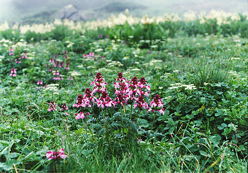 朝4時から頂上に登ったが、霧でご来光も四囲の山もみられず、畳平に下った。朝食後歩いたお花畑は十分に満足できるものだった。