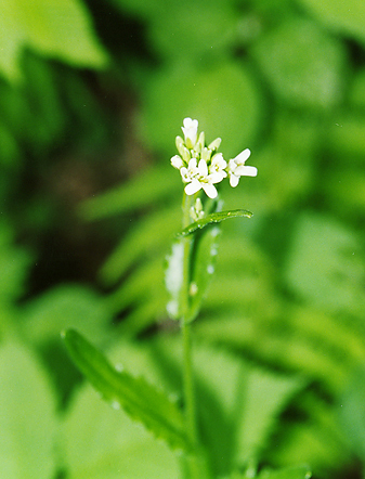 標高1300を越え、そろそろ残雪に道を阻まれる辺り、礫がごろごろしている斜面に咲いていた。一瞬礼文のハマハタザオを思い出したが、場所柄ハマではないとカメラを構えた。 葉の鋸歯が目立った。