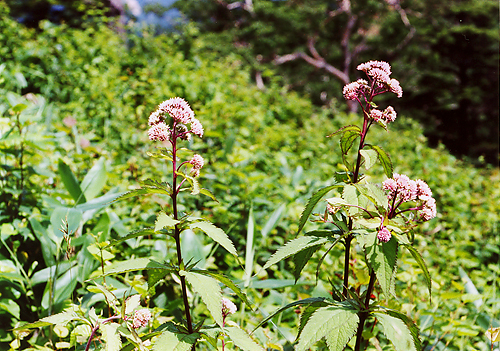(キク科)| 栂池のゴンドラの下はこの花の見事な盛りであった。霧が峰でも点々と緑の草原を彩って目を楽しませてくれた。ふと気が付いたらこの花の写真がない。 あまりに身近で、対面の感激がないのかも知れない。派手ではないが、淡紅色の花を凛と捧げてたくましい。反省とお詫びを込めてシャッターを落とした。 |