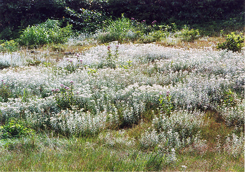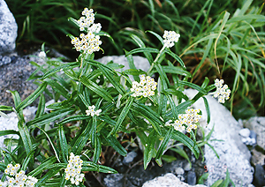 | 千畳敷カールを散策していた時のものである。山でハハコグサは比較的多い。花に興味を持ち始めた頃は、 やや白っぽい葉にエーデルワイスではないかと心をときめかした。何回かウスユキソウを見た今は、どうして似ていると思ったのかおかしい気がする。 |