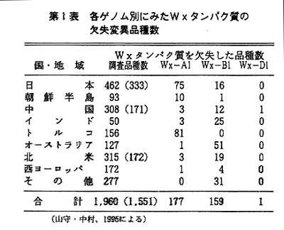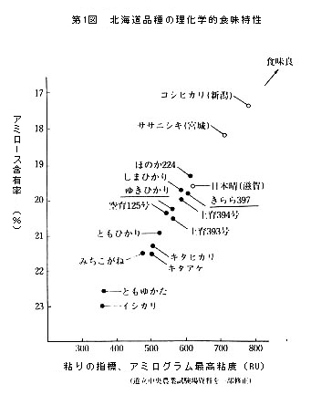 日本人はモチ好きネバネバした食感が嗜好として定着し、餅を好む食文化を育ててきたのだろう。ネバネバ嗜好は餅だけではなく、毎日のご飯やうどんにもあるらしい。 最近の研究から、その二・三の例をひろってみよう。 「きらら397」の誕生北海道の良食味米「きらら397」が消費者の人気を集めている。だが、一昔前までの道産米は、炊くとパサパサで粘りがなく「猫も跨いで通る」、 と陰口されていた。この不評の道産米を一躍良食味米に変身させたのが、ネバネバ嗜好に着目した品種改良である。穀物のでん粉には普通、アミロペクチンとアミロースの二種類がある。アミロースが欠け、アミロペクチンだけのものがモチ米で、 ウルチ米にはアミロペクチンも含むが、アミロースの含有率が高いほど粘りがなく、パサパサ感が強くなる。 第1図をご覧いただきたい。「イシカリ」など、かつての道産米はアミロース含有率が21〜23%で粘りがなく、 良食味米の代表格の新潟産「コシヒカリ」や、宮城産「ササニシキ」の16〜18%に比べて著しくアミロース含有率が高かった。 この事実に気づいたのが、いま北海道の上川農業試験場土壌肥料科長の稲津脩(おさむ)さんである。道産米の食味改善には低アミロース化が決め手になることを提唱した。 昭和55年、道立農業試験場の総力を上げた「優良米の早期開発研究」プロジェクトが発足すると、彼の提案は品種改良の最重点事項としてとり上げられ、 佐々木多喜雄さんたち育種グループによる低アミロース系統品種の選抜が始められたのである。 年間2万点に及ぶ育成系統のアミロース測定は容易なことでなく、高価なオート・アナライザーと、これを駆使する育種態勢が必要である。 農業試験場関係者の熱意と、これに応えた財務当局の支援が、この難事業を完遂させたのである。努力はみのり、昭和59年に「ゆきひかり」、 そして63年に「きらら397」(第1図の傍線品種)が育成された。良食味の道産米はこれ以降、次々と世に出るようになった。 |